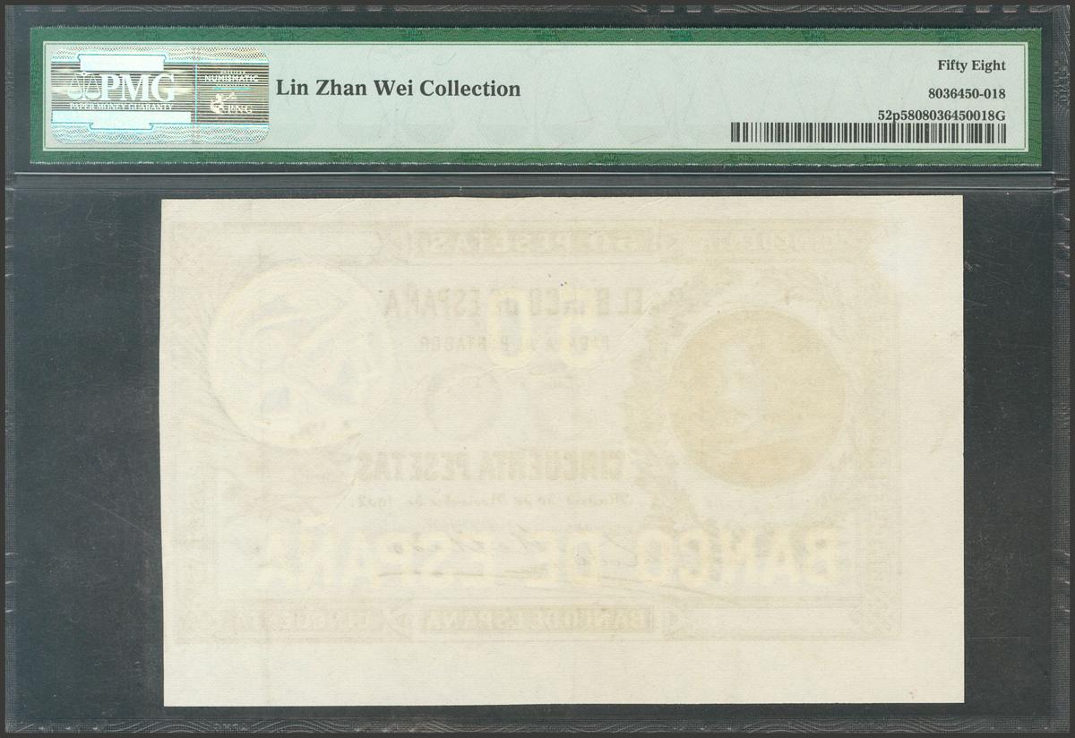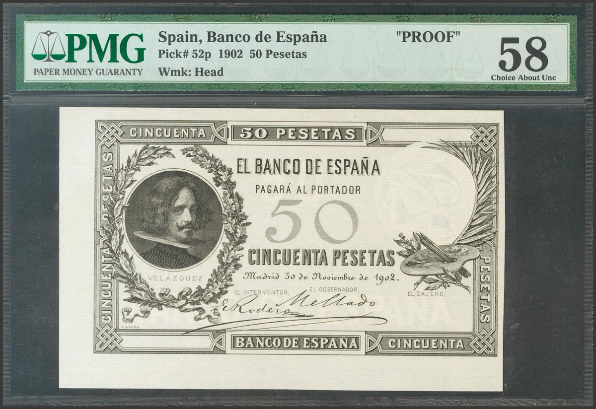Proof of the obverse of the 50 Pesetas note issued on November 30, 1902. (Edifil 2017: 309P). Good Extremely Fine. PMG58 package.