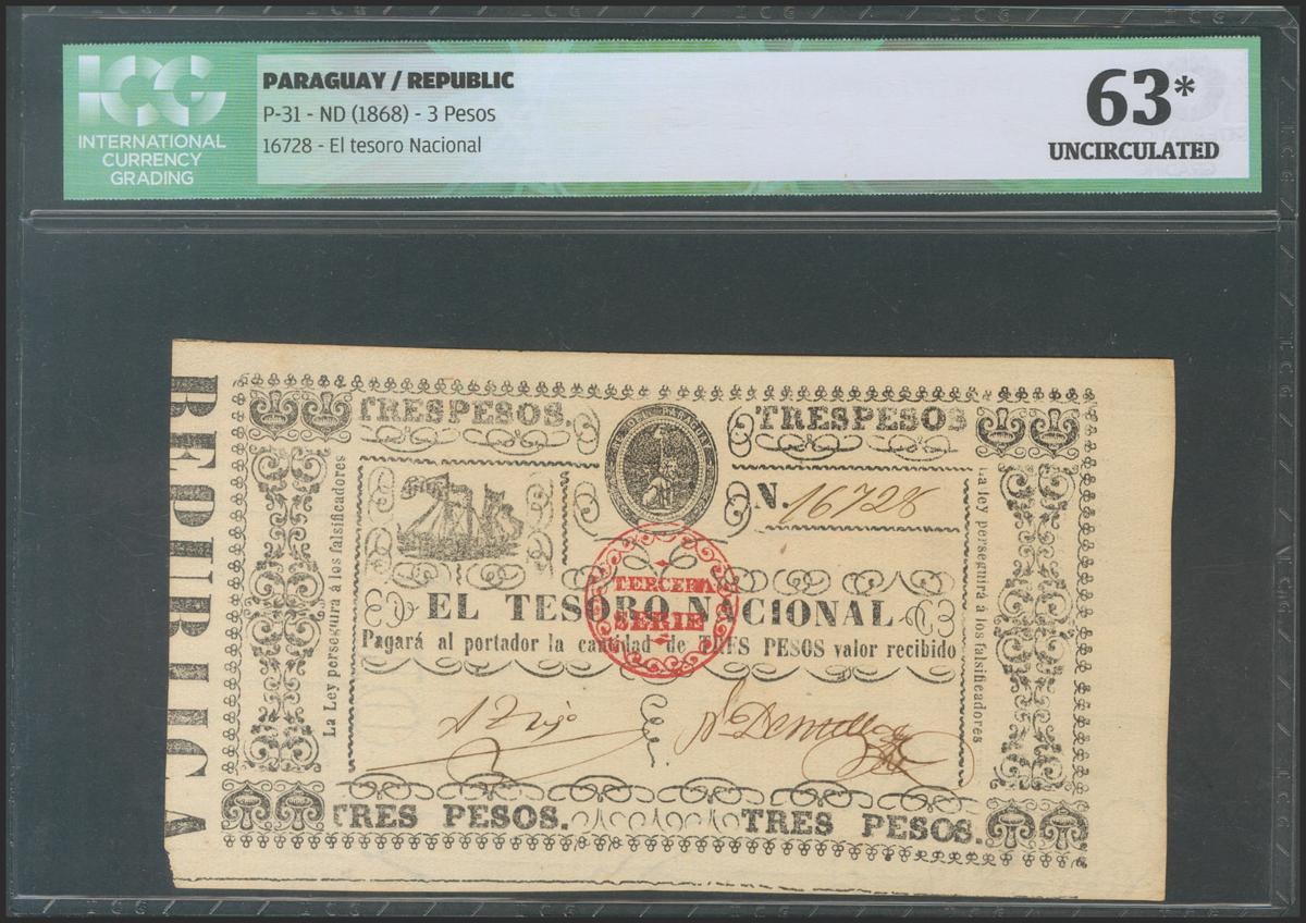 PARAGUAY. 3 Weights. (1868ca). (Pick: 31). ICG63 * (Lower left corner missing).