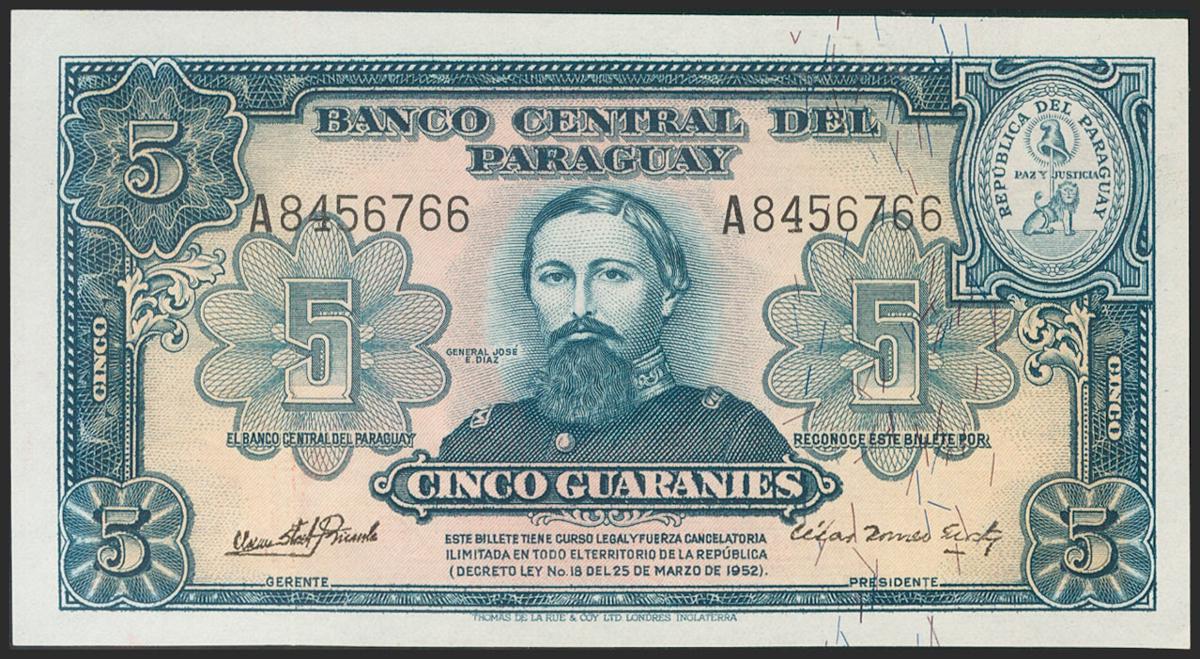 PARAGUAY. 5 Guaranies. 1952. (Pick: 186c). Uncirculated.