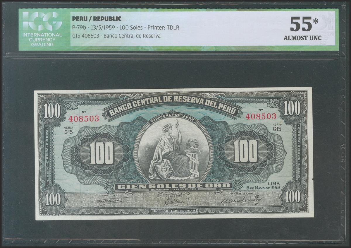 PERU. 100 Suns. May 13, 1959. G12 Series. (Pick: 79b). ICG55 * (Multiple tiny pinholes at left).