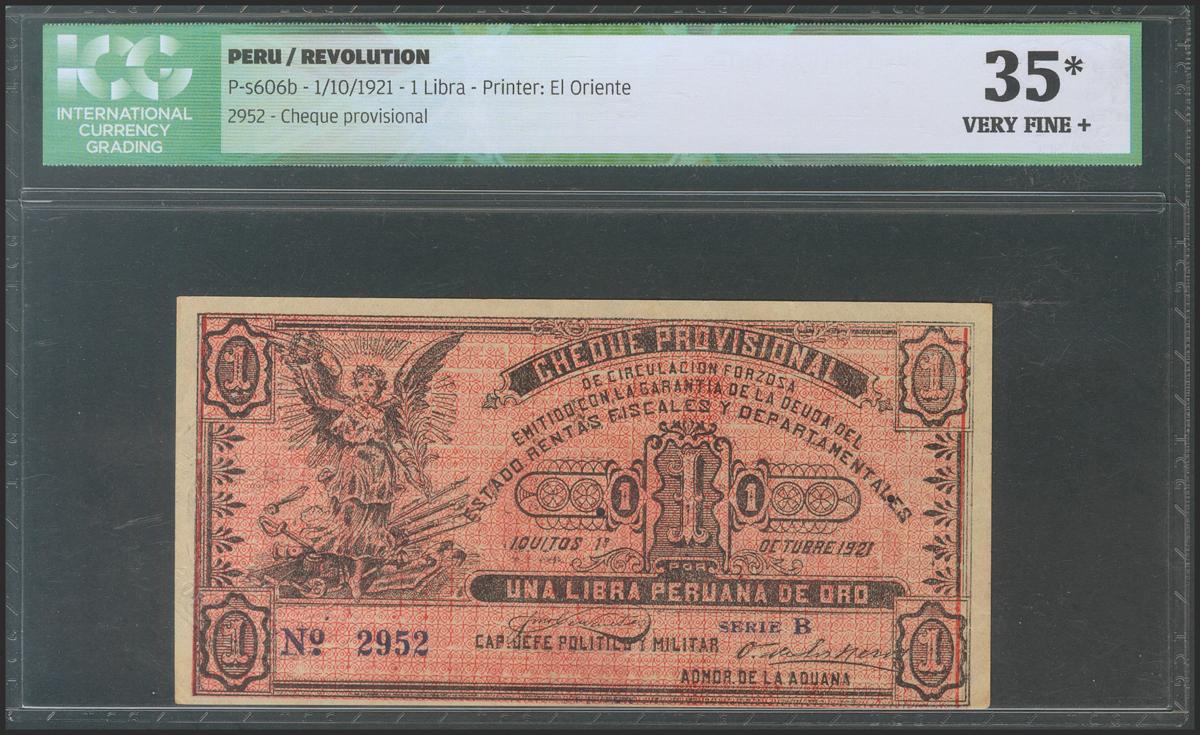 PERU REVOLUTION. 1 Pound. 1 October 1921. Series B. (Pick: s606b). ICG35 * (Small hole at center).