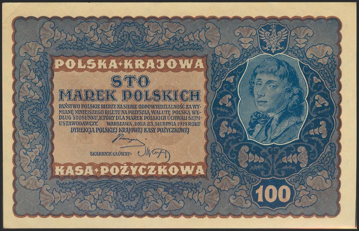 POLAND. 100 Marek. 1919. Serial number without comma. (Pick: 27). Minor mishandling on margins and a soft fold on one corner. About Uncirculated.