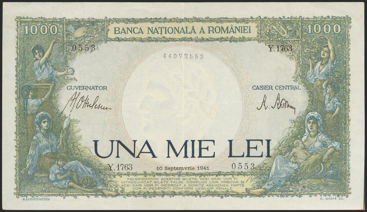 ROMANIA. 1000 Lei. 1941. (Pick: 52a). Small nick on bottom edge. Better than Very Fine.