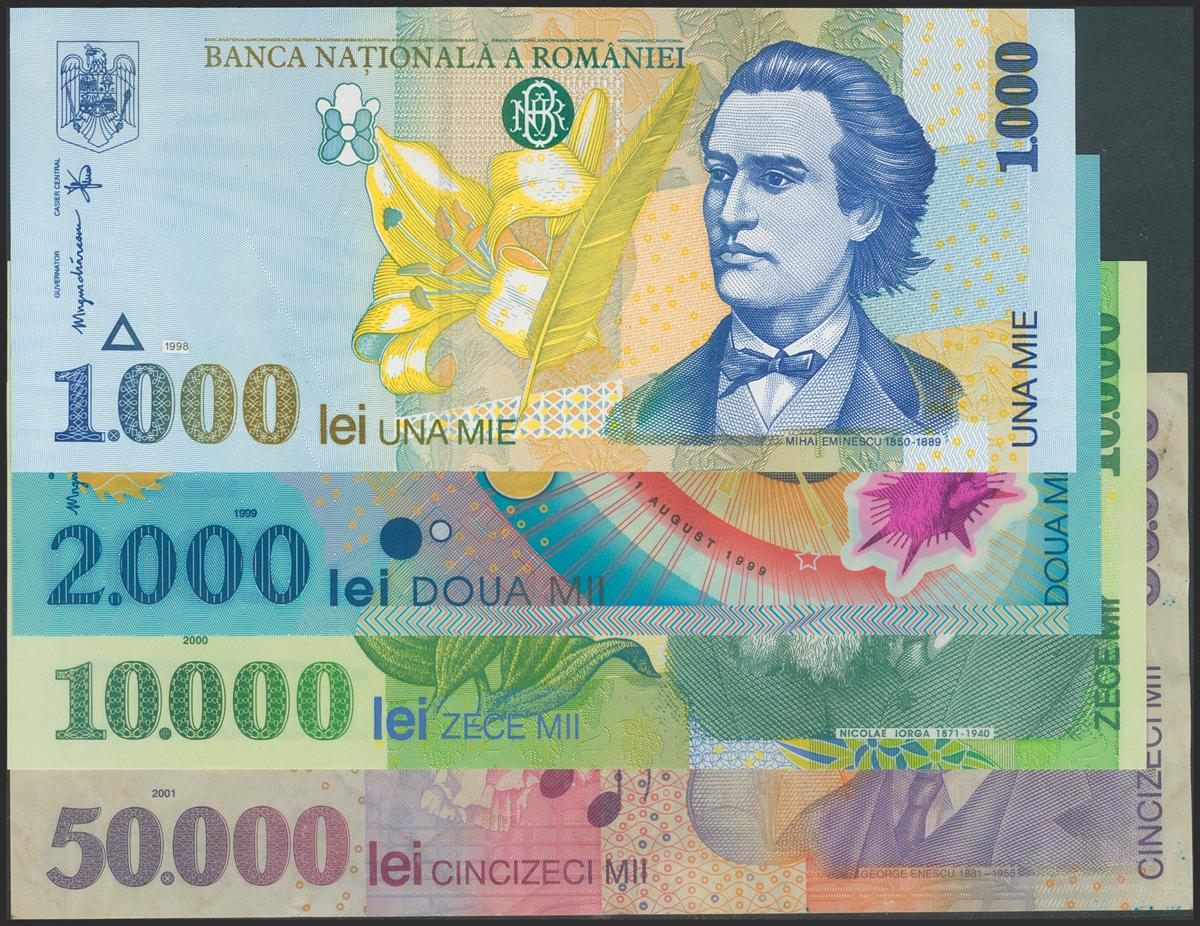 English ROMANIA. Set of 4 banknotes: 1000 Lei, 2000 Lei, 10000 Lei and 50000 Lei. 1998-2001. Banca Nationala Romaniei. 106 is type I, with BNR in italics. (Pick: 106, 111a, 112a, 113a). Very Fine to Uncirculated.