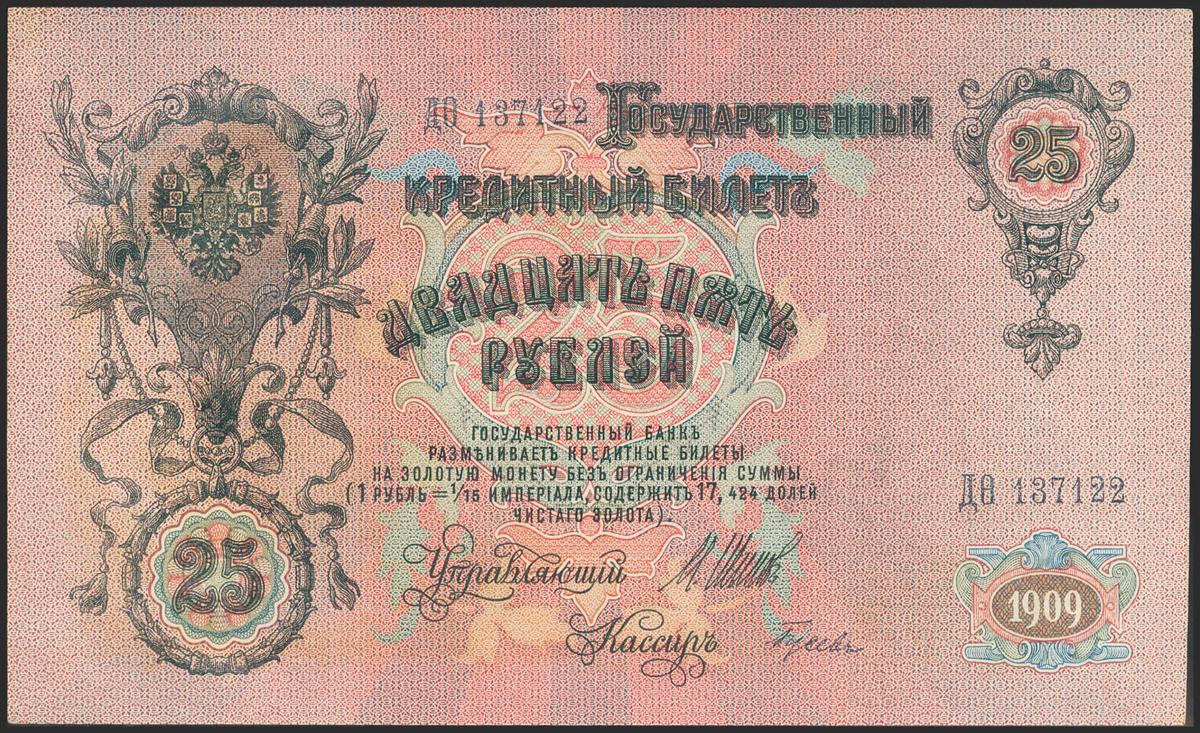 RUSSIA. 25 Rubles. 1909 (1912). Provisional Government. Signatures: Shipov and Gusiev. (Pick: 12b). Imperfect corners, large banknote. About Uncirculated.