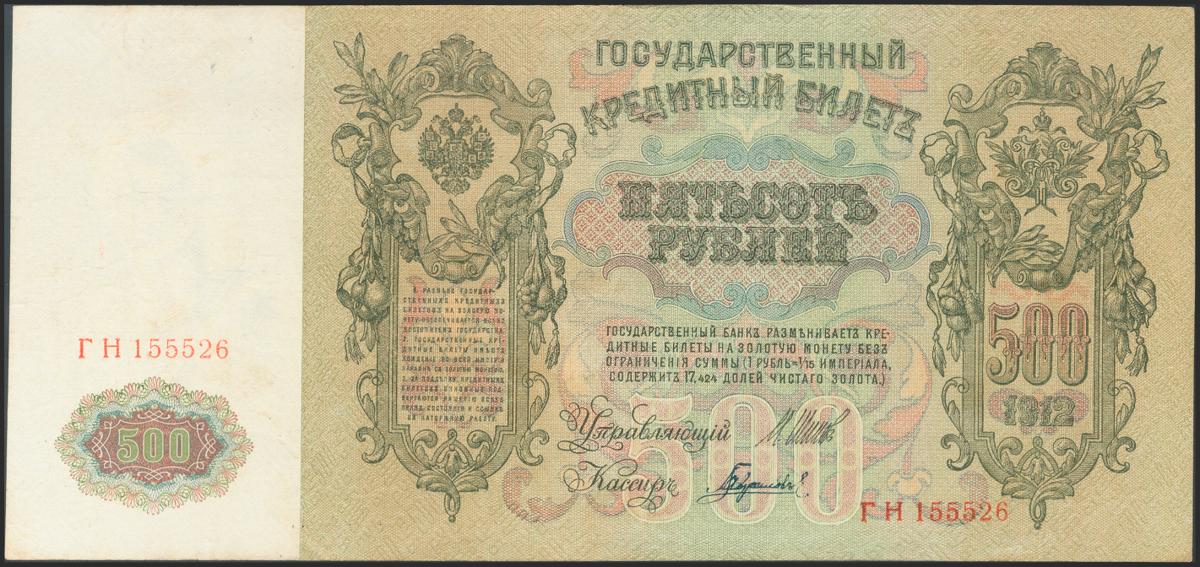 RUSSIA. 500 Rubles. 1912. Signatures: Shipov and Gavrilov. (Pick: 14b). Very large note and very crispy paper. Extremely Fine.