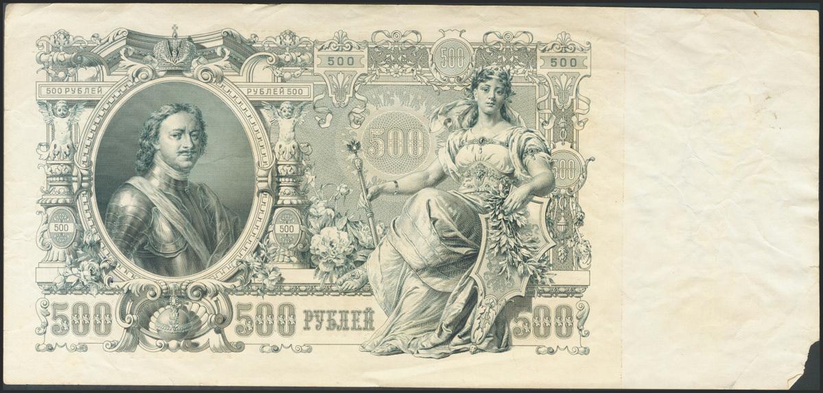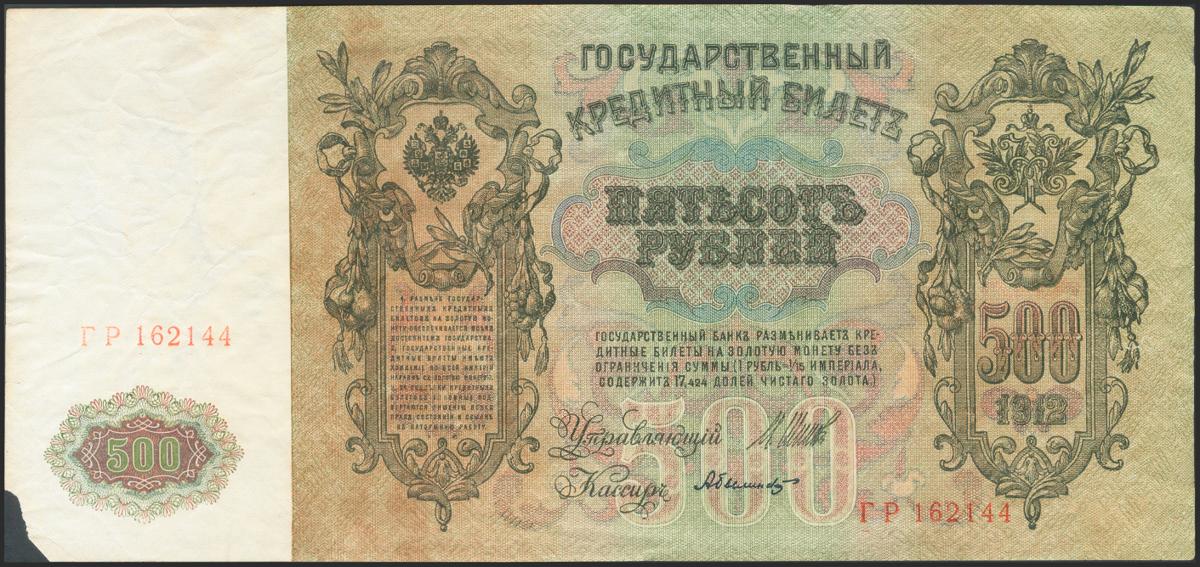 RUSSIA. 500 Rubles. 1912. Signatures: Shipov and Bilinsky. (Pick: 14b). Very large note, fine in general, missing bottom left corner. Good.