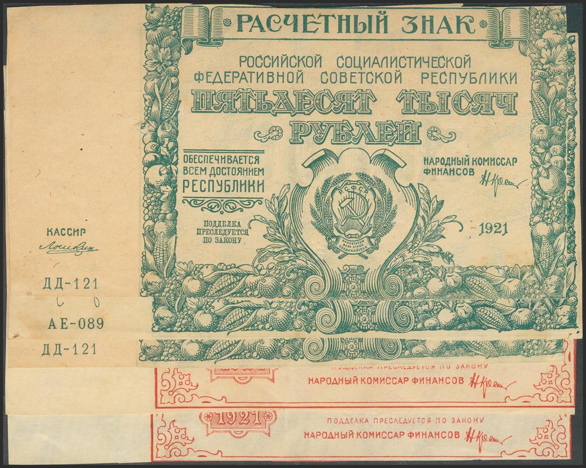 RUSSIA. Set of 6 banknotes: 50,000 Rubles (4), 100,000 Rubles. 1921. Some different signatures. (Pick: 116a, 117a). 116a present pinholes and small holes. Extremely Fine. TO EXAM.