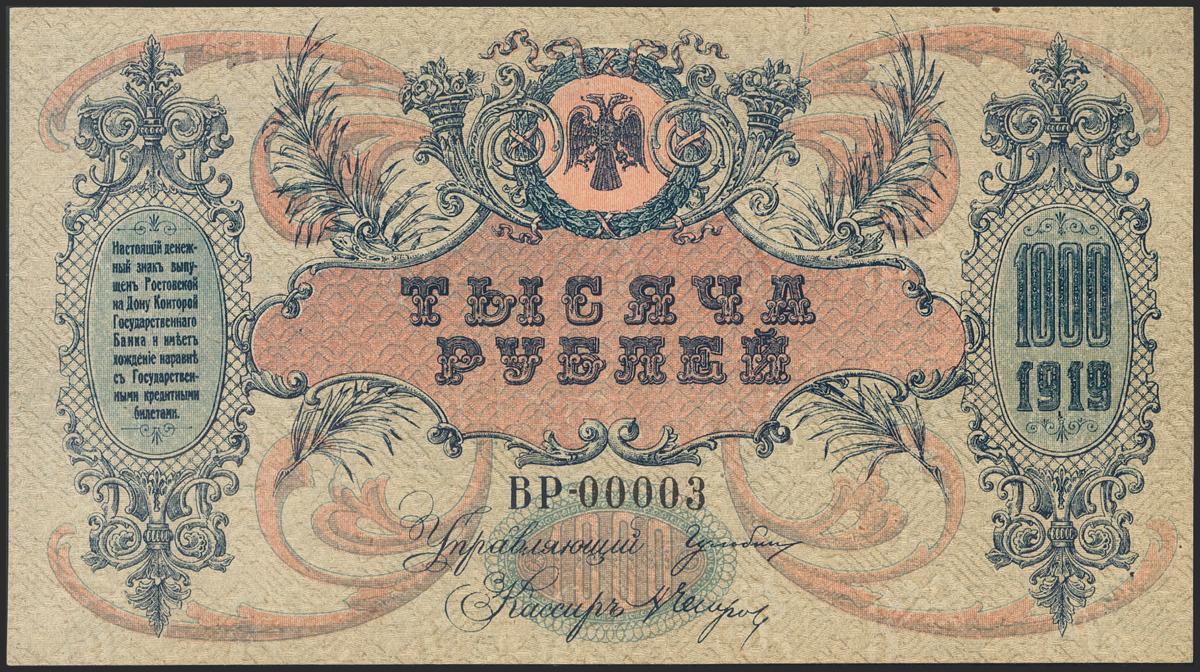 RUSSIA. 1000 rubles. 1919. South Russia. (Pick: S418b). Very tiny nick on top edge and some mishandling in some corners. About Uncirculated.