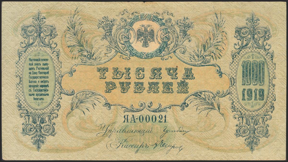RUSSIA. 1000 rubles. 1919. South Russia. (Pick: S418c). Small tear on top edge, some mishandling on edges. Better than Very Fine.