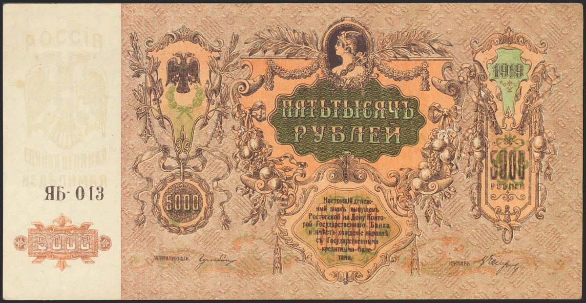 RUSSIA. 5000 Rubles. 1919. South Russia. (Pick: S419d). Very large note, no folds, some mishandling on edges and corners. Better than Extremely Fine.