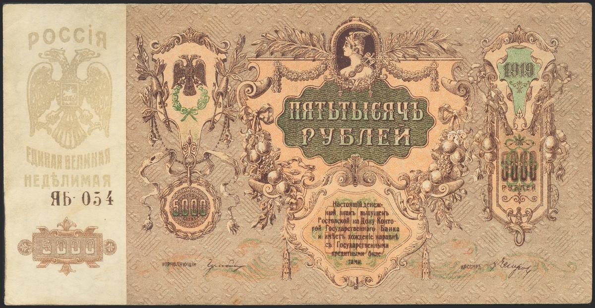 English RUSSIA. 5000 Rubles. 1919. South Russia. (Pick: S419d). Very large note, central crease, some mishandling on edges and corners. Extremely Fine.