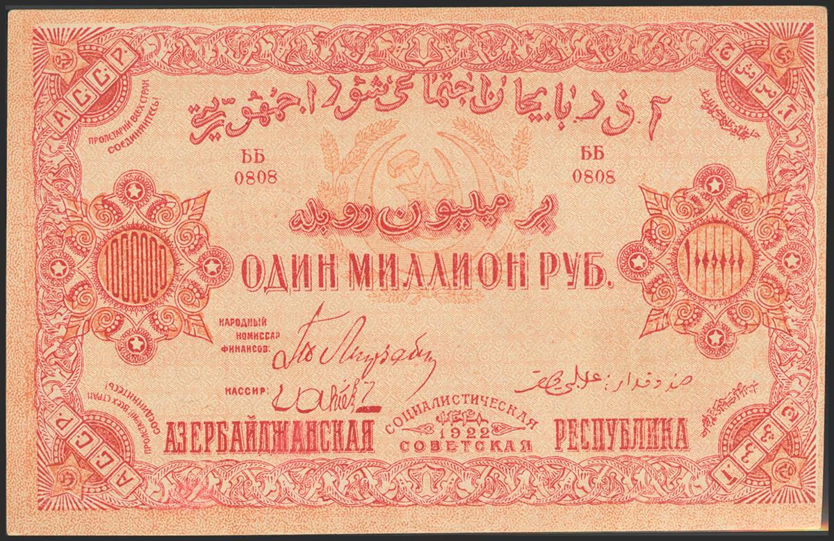 English RUSSIA (TRANSCAUCASIA). 1000000 Rubles. 1922. Azerbaijan Socialist Soviet Republic. (Pick: S719a). Rare, small nick on right edge and very small tear also on right edge, rounded corners. About Uncirculated.