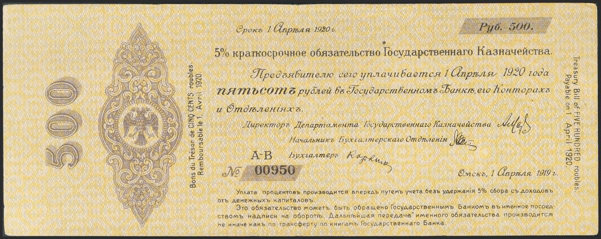 RUSSIA. 500 Rubles. 1920. Siberia and Urals. Treasury Bill. Omsk. (Pick: S854b). Very Fine.