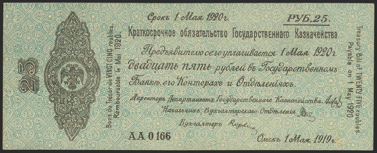 RUSSIA. 25 Rubles. 1919. Siberia and Urals. Due May 1920. (Pick: S855a). No folds, only imperfect corners. About Uncirculated.