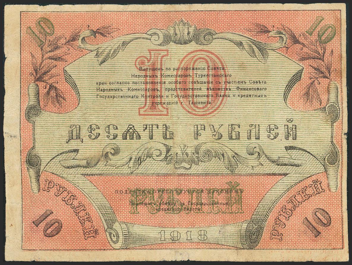 RUSSIA. 10 Rubles. 1918. Russian Central Asia. Tashkent. (Pick: S1154a). Rare. One small tear on top margin plus some nicks, very appealing to the eye. About Very Fine.