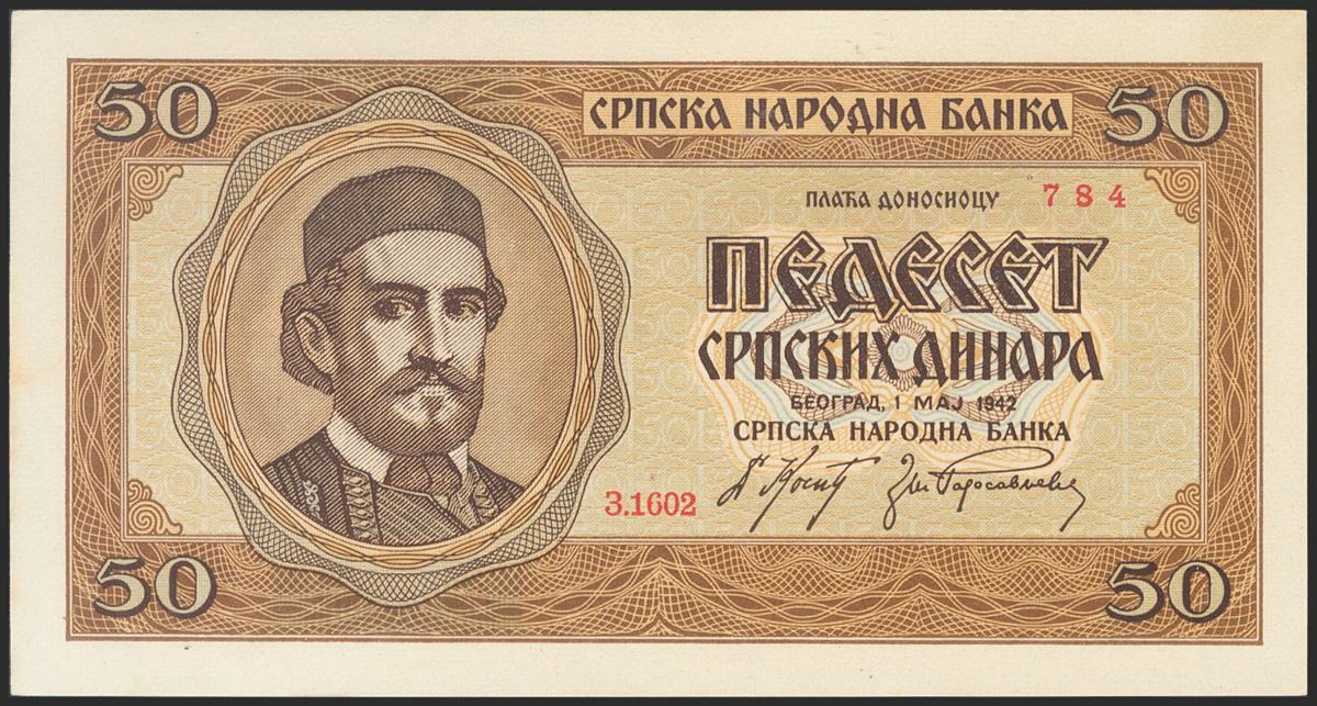 SERBIA. 50 Dinara. 1942. (Pick: 29). Slight oxidation on left margin. About Uncirculated.