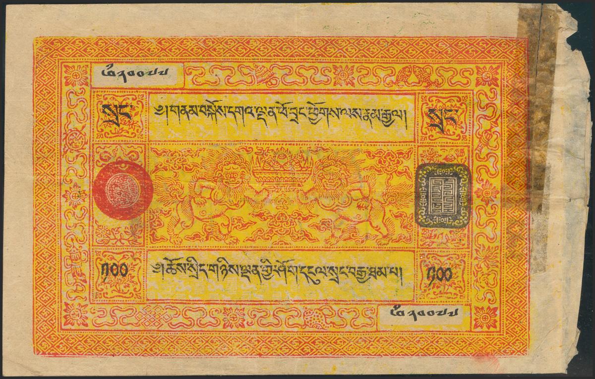 TIBET. 100 Srang. ND (1942-1959). Autonomous Government of Tibet. Type IV. Text 93 mm. S / N 020077. (Pick: 11a). Pinholes, large tear taped at right margin. Fine.