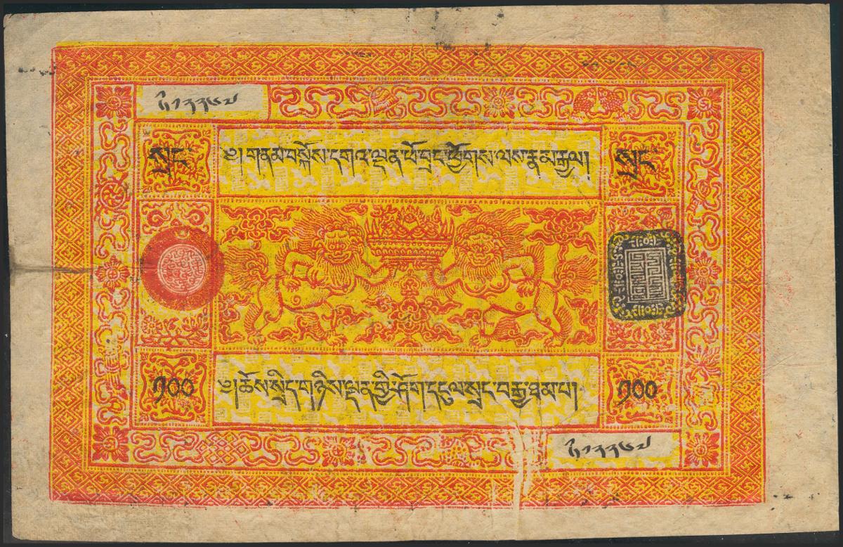 TIBET. 100 Srang. ND (1942-1959). Autonomous Government of Tibet. Type IV. Text 93 mm. S / N 192267. (Pick: 11a). Pinholes, restoration at left margin. Very Fine.