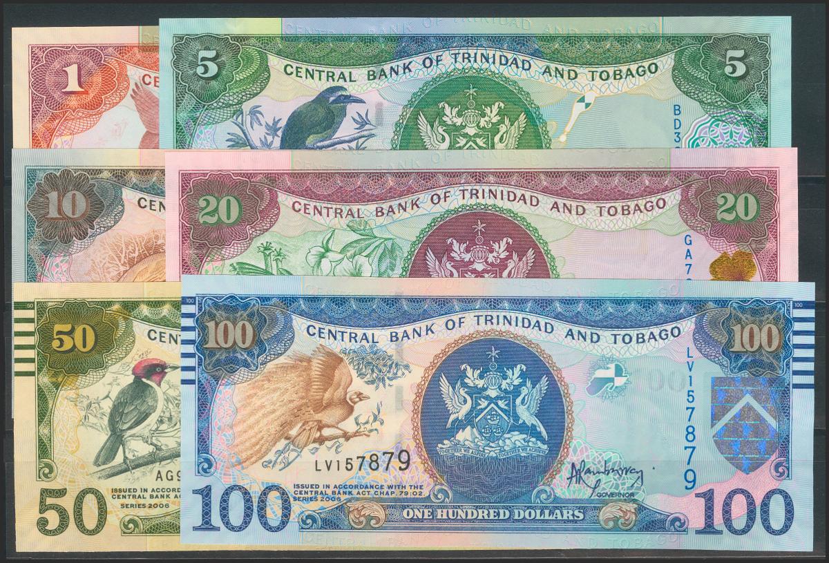 English TRINIDAD AND TOBAGO. 1 Dollars, 5 Dollars, 10 Dollars, 20 Dollars, 50 Dollars and 100 Dollars. 2006. (Pick: 46/51). Uncirculated.