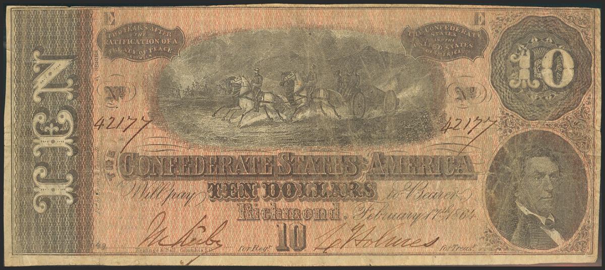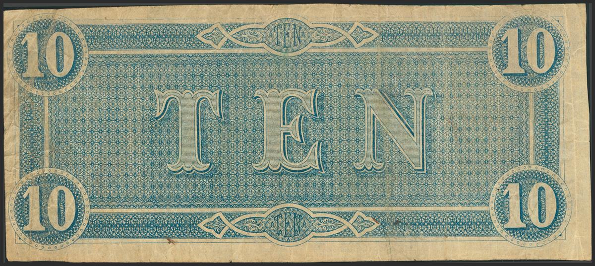 CONFEDERATE STATES OF AMERICA. 10 Dollars. 1864. (Pick: 68, Friedberg: CS-68). Pinholes. Better than Fine.
