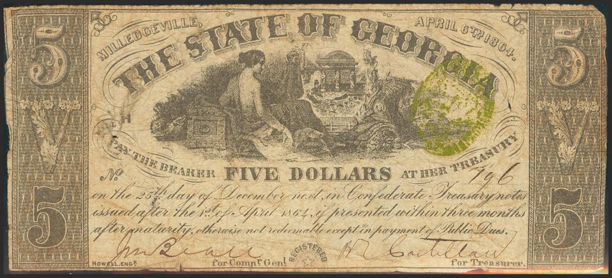 UNITED STATES OF AMERICA. Obsolete currency. 5 Dollars. 1864. The State of Georgia. (Pick: Not Listed). Pinholes, small holes. Very Good.