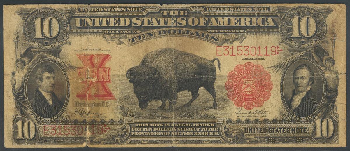 UNITED STATES OF AMERICA. 10 Dollars. 1901. Signatures: Speelman and White. (Pick: 185, Friedberg: 122). Very rare in any condition, the famous Bison note, non-mule type. One large tear, no repairs, all original. Fair.