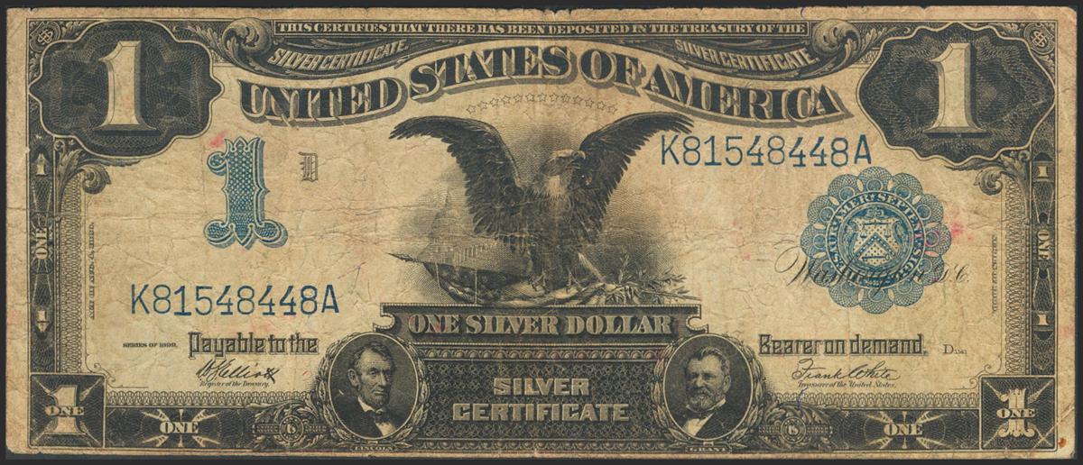 English UNITED STATES OF AMERICA. 1 USD. 1899. Silver Certificate. Signatures: Elliott and White. Non mule type. (Pick: 338c, Friedberg: 235). No pinholes, no tears, only nicks and usual degradation on eges. About Fine.