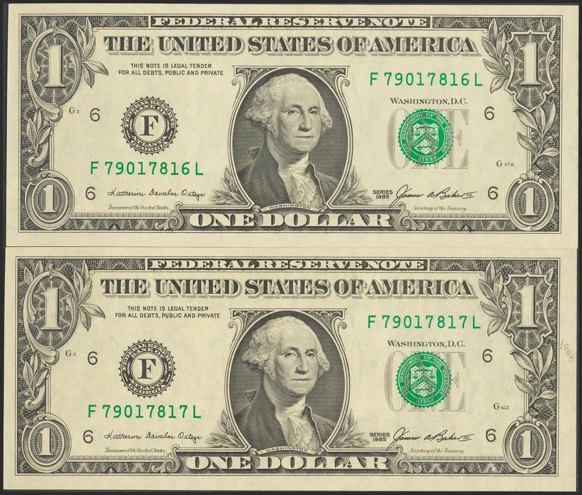 UNITES STATES OF AMERICA. Set of 2 banknotes of 1 Dollar. 1985. Federal Reserve Note. Atlanta. (Pick: 474) (Friedberg: 1913-F). Correlative run. Uncirculated.