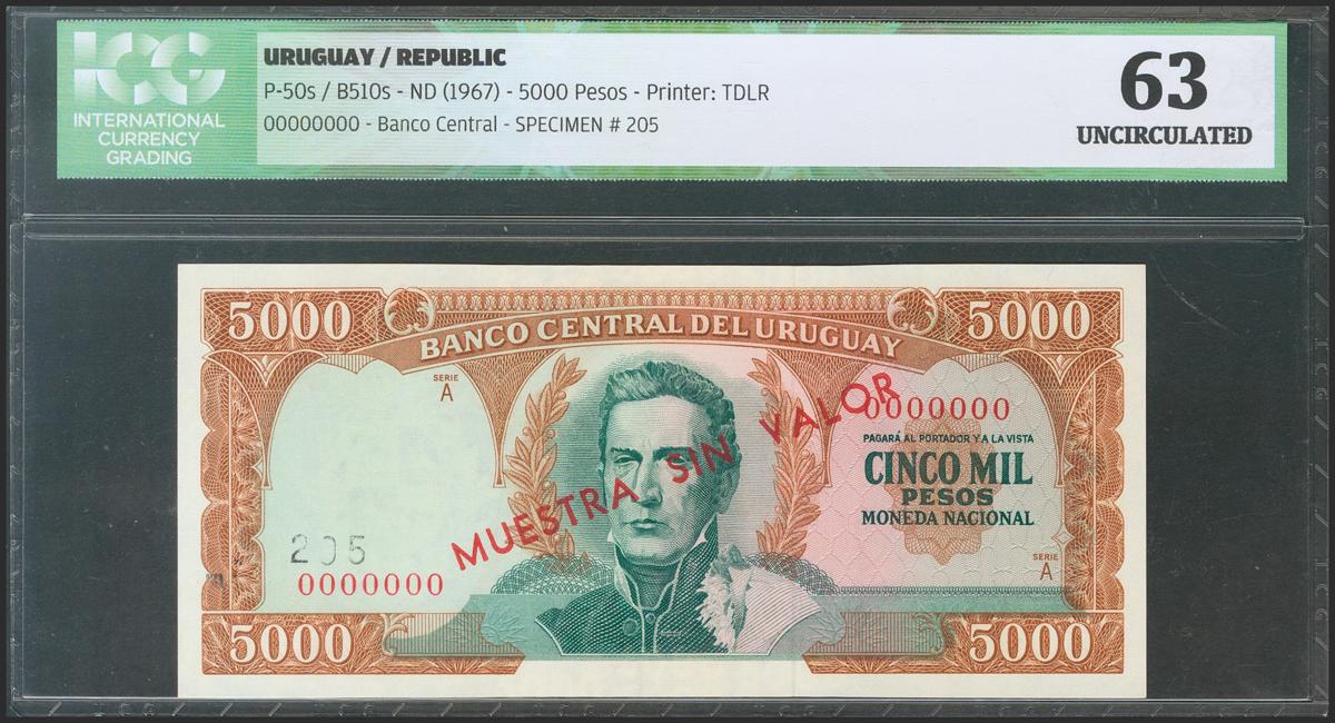 URUGUAY. 5000 pesos. (1967ca). Specimen. (Pick: 49s). ICG63.