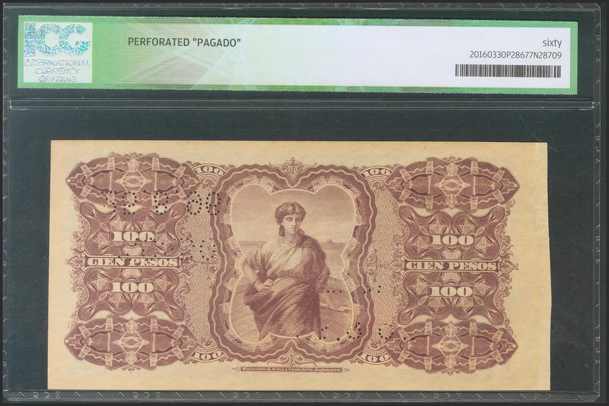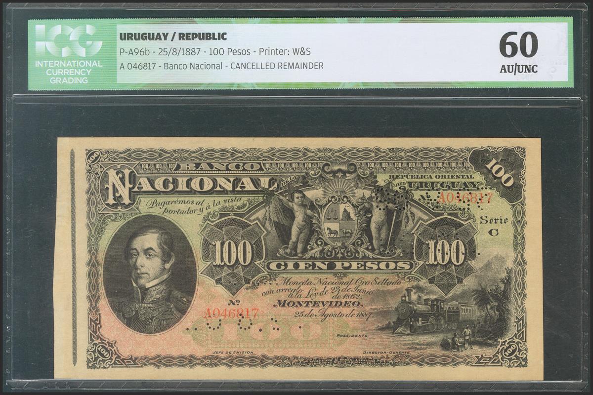 English URUGUAY. 100 pesos. August 25, 1887. Series A. Canceled remainder. (Pick: A96b). Rare. ICG60.