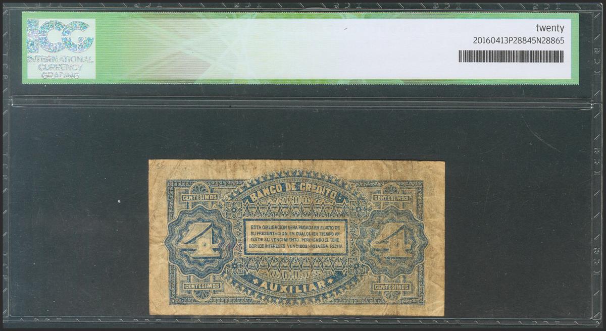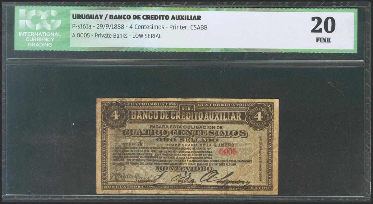 URUGUAY (AUXILIARY CREDIT BANK). 4 hundredths. 29 September 1888. Series A. Numeration Low. (Pick: s161a). ICG20.