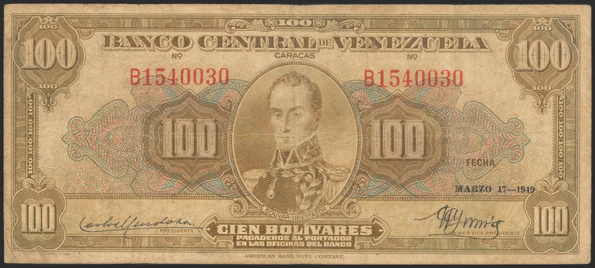 VENEZUELA. 100 Bolivars. March 17, 1949. Signatures: Carlos Mendoza and González Gorrondona. Series B. (Pick: 34a, Sleiman: 30). VF.