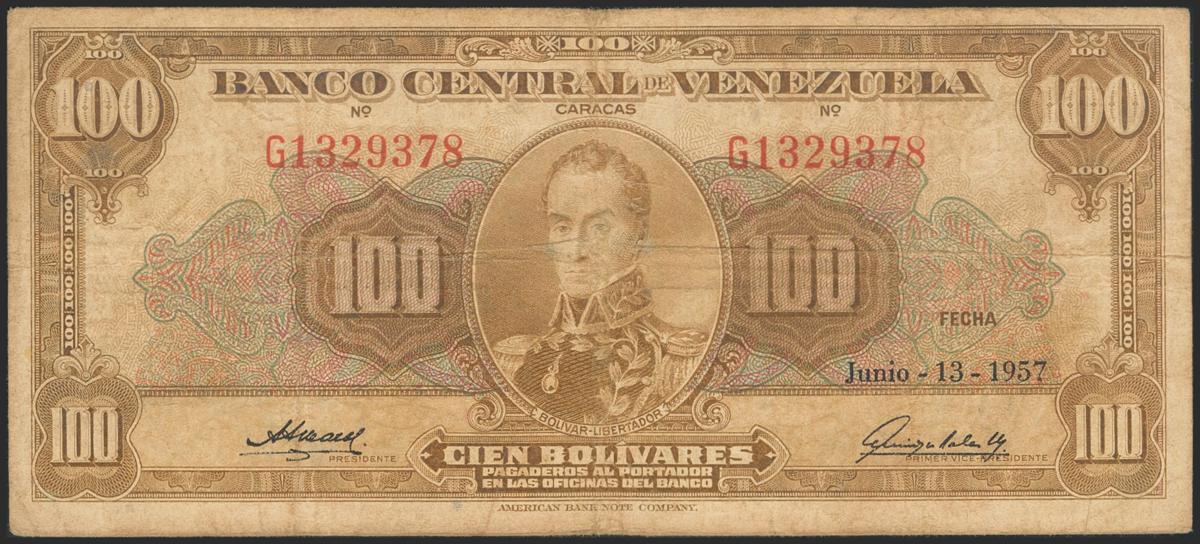 VENEZUELA. 100 Bolivars. July 13, 1957. Signatures of Aurelio Arreaza and Enrique Salas. Series G. (Pick: 34c, Sleiman: 58). Very Fine.
