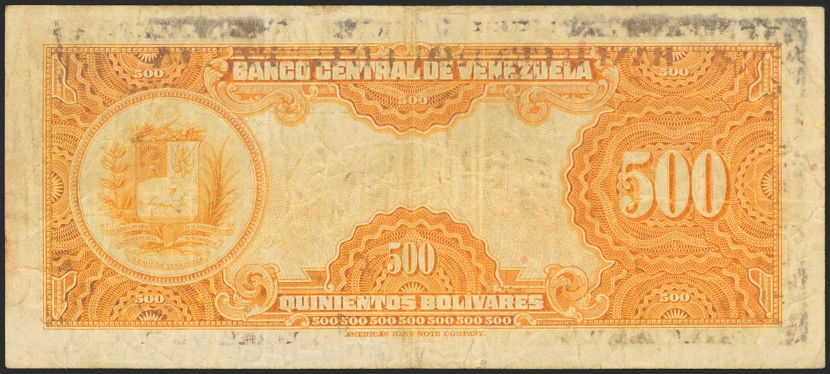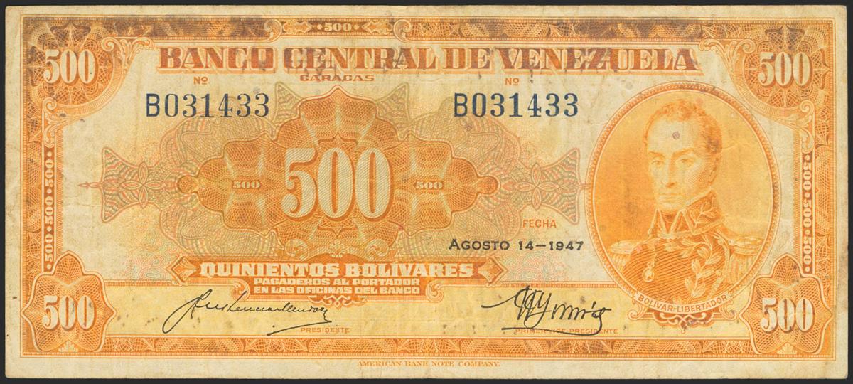VENEZUELA. 500 Bolivars. August 14, 1947. Signatures: Herrera Mendoza and González Gorrondona. Series B. (Pick: 37a, Sleiman: 15). XF-.