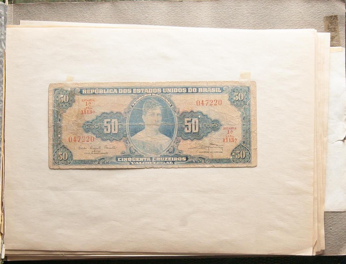 WORLD. Set of 86 banknotes hinged in an old album, includes a very interesting Brazil Pick 65 counterfeit. TO EXAM.