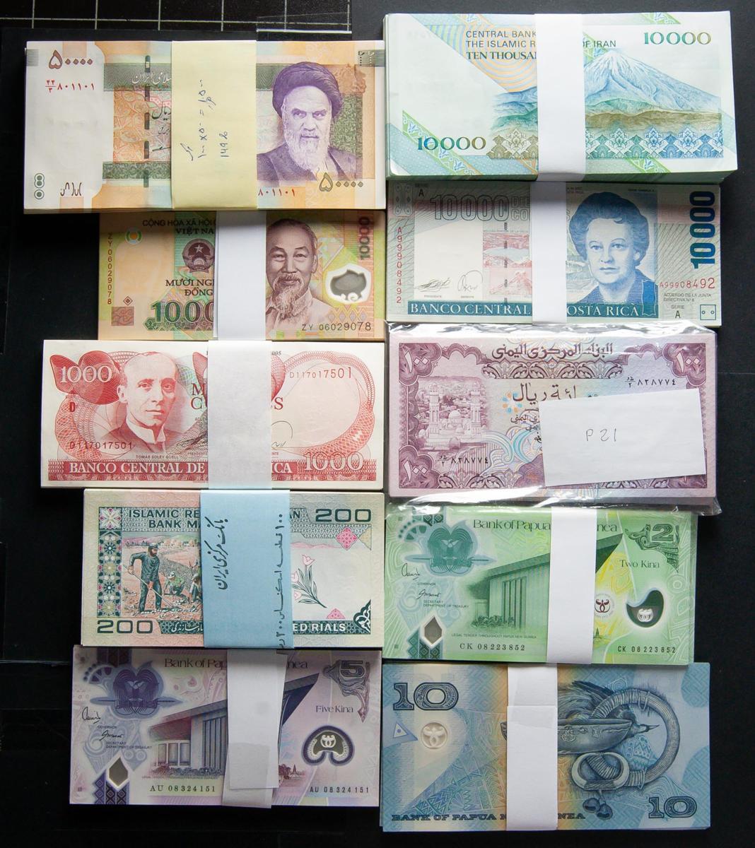 WORLD. Large stock of 70 different banknotes, in different quantities, all modern issues, uncirculated (some with the original seal of the printing factory), including some complete series from different countries. TO EXAM.
