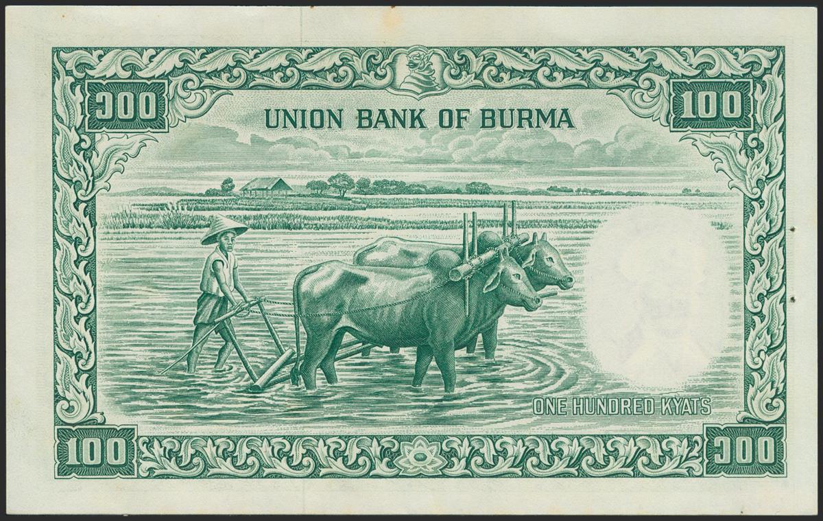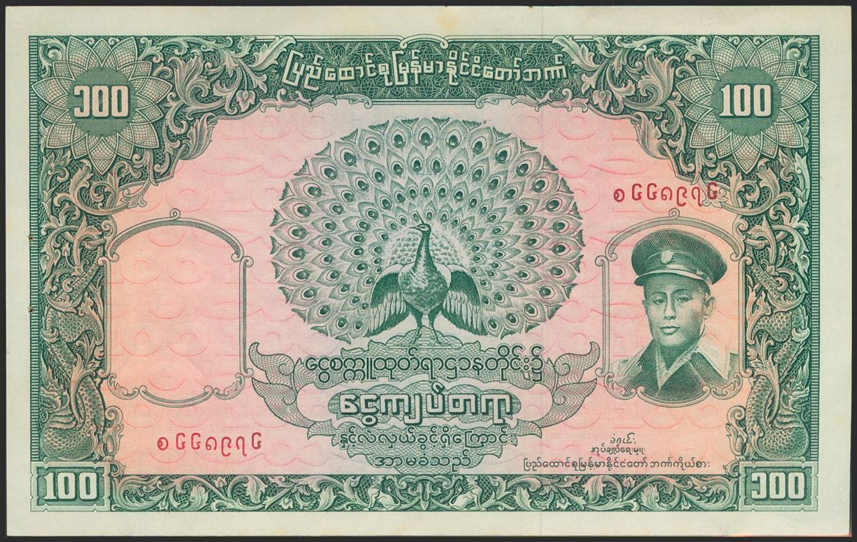 BURMA. 100 Kyats. 1958. (Pick: 51a). Typical staple holes. About Uncirculated.