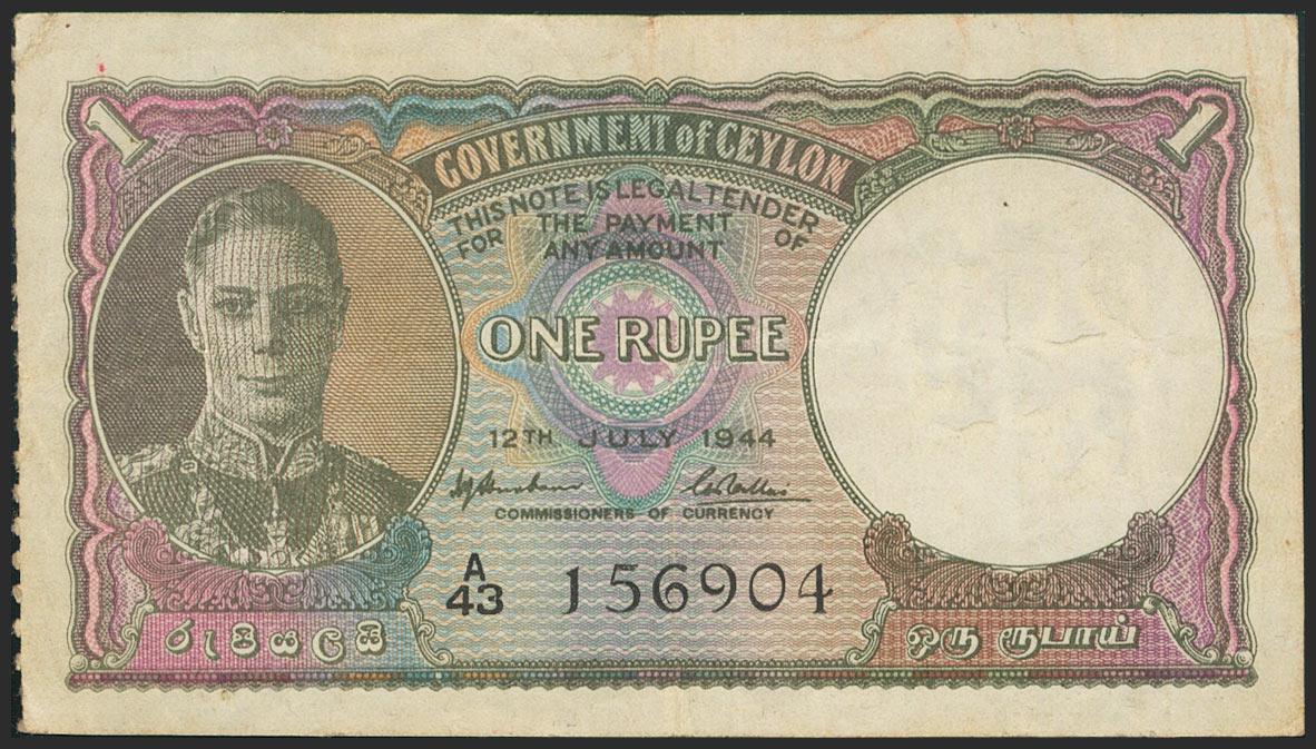 CEYLON. 1 Rupee. 1944. (Pick: 34). Very Fine.