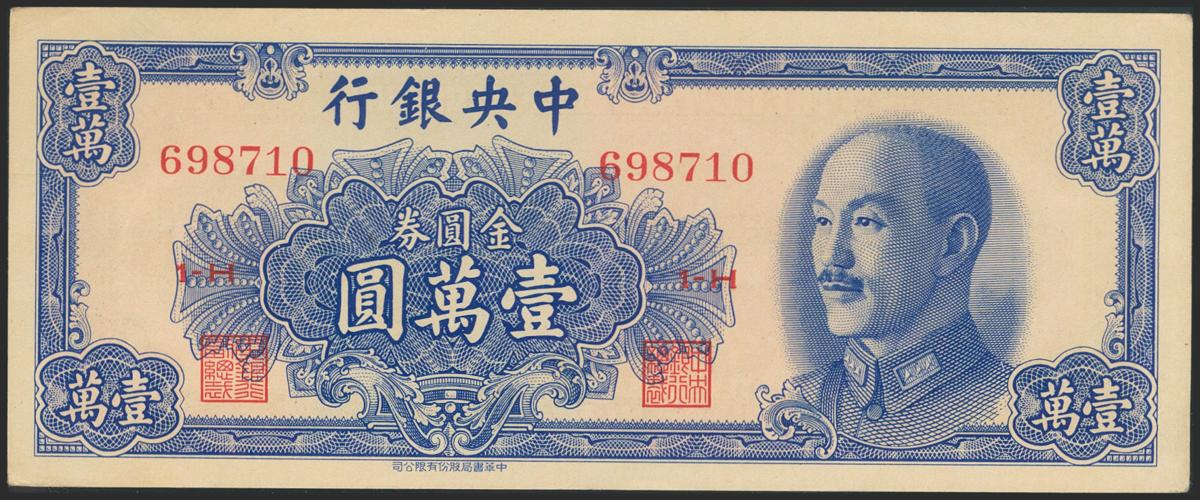 CHINA (REPUBLIC). 10000 Gold Yuan. 1949. Central Bank of China. (Pick: 416). Light fold, imperfect corners. Extremely Fine.