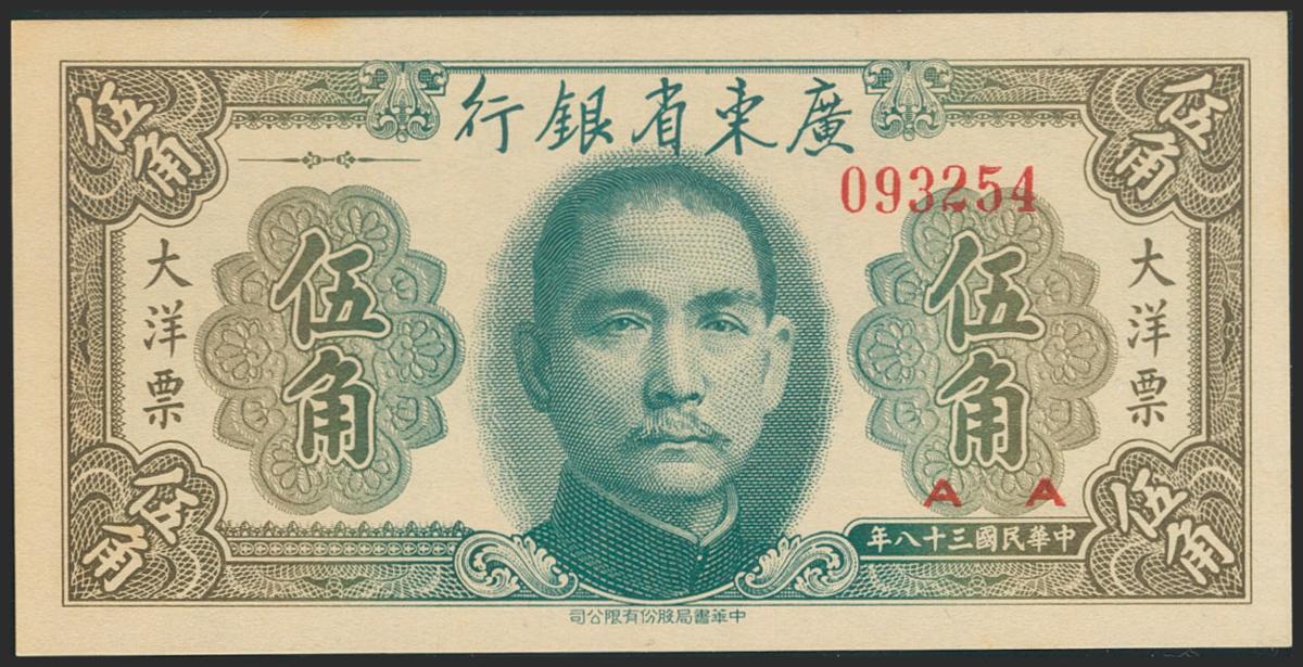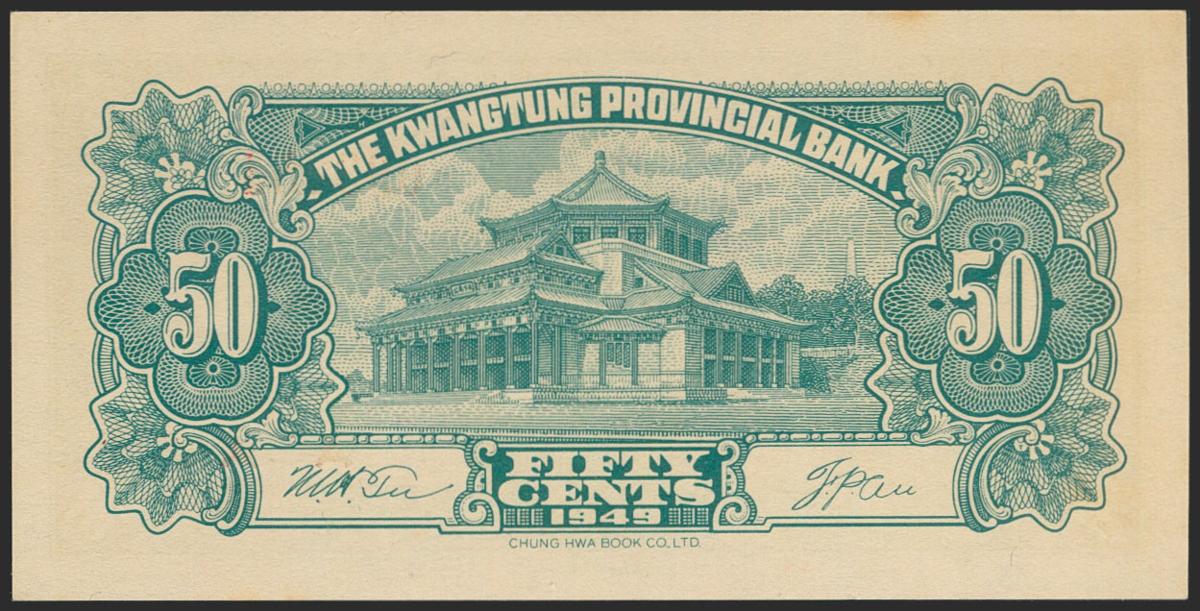 English CHINA (REPUBLIC). 50 Cent. 1949. Kwangtung Provincial Bank. (Pick: S2455). Very light foxing spot on top margin. Uncirculated.