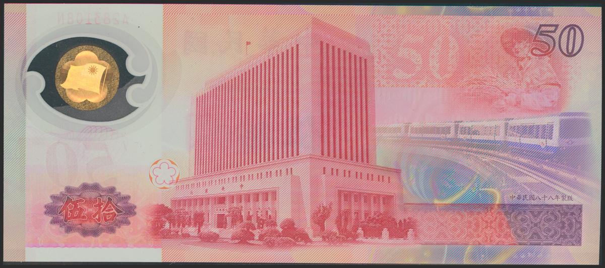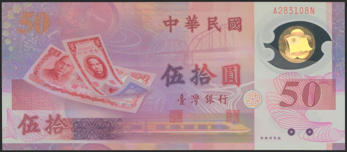 English CHINA (TAIWAN). 50 Yuan. 1999. Bank of Taiwan. 50th Anniversary of Taiwan polymer issue. (Pick: 1990). Uncirculated.