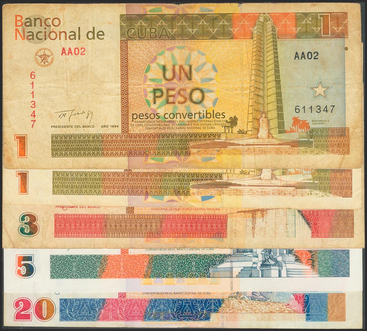CUBA. Set of 5 banknotes of 1 Peso (2), 3 Pesos, 5 Pesos and 20 Convertible Pesos. (1994ca). (Pick: FX37, FX46d, FX47b, FX48f, FX50a). Fine / Extremely Fine.
