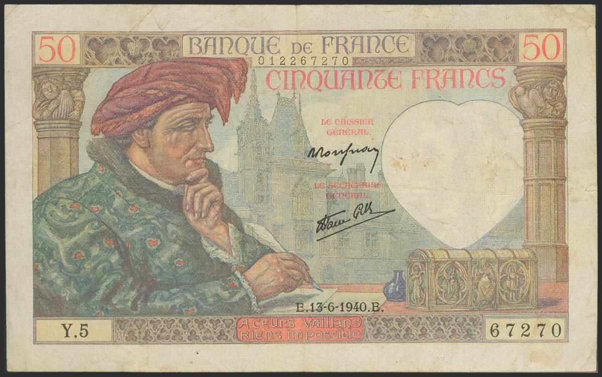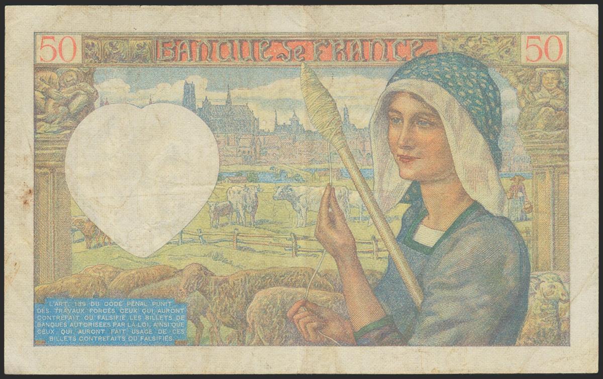 FRANCE. 50 Francs. 1940. (Pick: 93). Small nick on right edge, a bit dirty, but very crispy. Better than Very Fine.