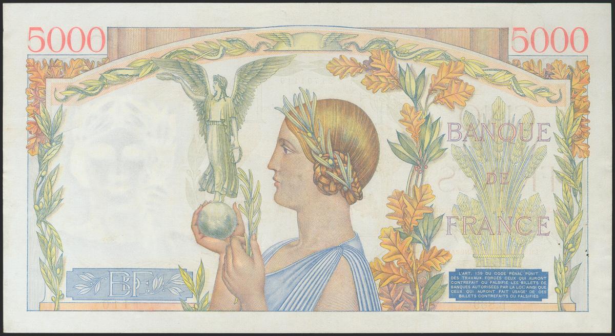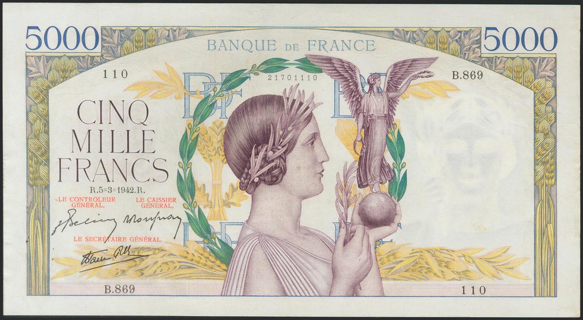 FRANCE. 5000 Francs. 1942. (Pick: 97c). Very large note, light fold and some mishandling, pinholes, really beautiful banknote with a delicate paper. Better than Extremely Fine.