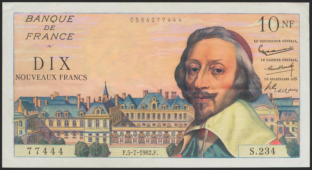 FRANCE. 10 Noveaux Francs. 1962. (Pick: 142a). Two pinholes on left. Very Fine.
