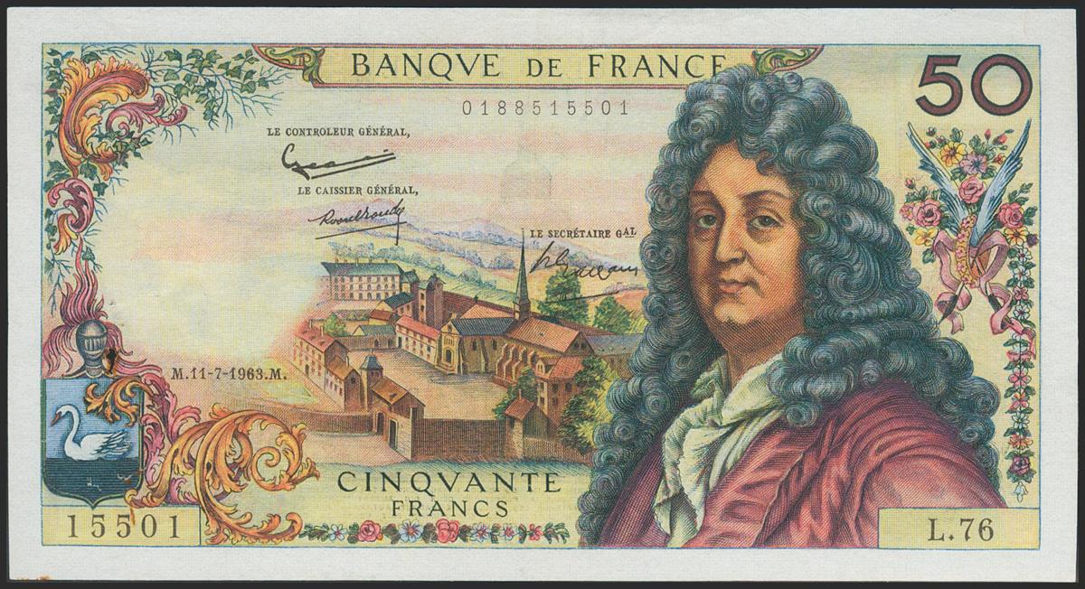 FRANCE. 50 Francs. 1963. (Pick: 148a). Hole and pinholes on coat of arms at left. Extremely Fine.