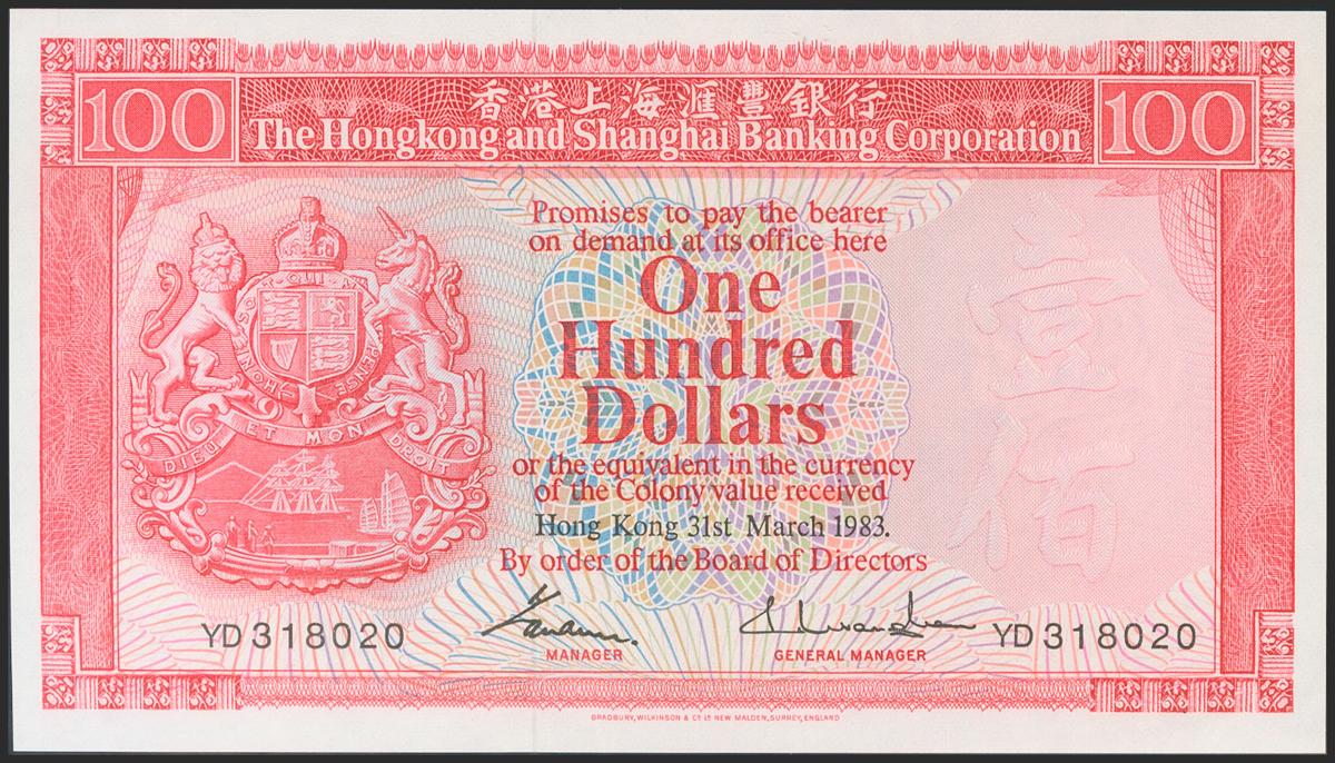 HONG KONG. 100 Dollars. 1983. The Hong Kong and Shanghai Banking Corporation. (Pick: 187d). Uncirculated.