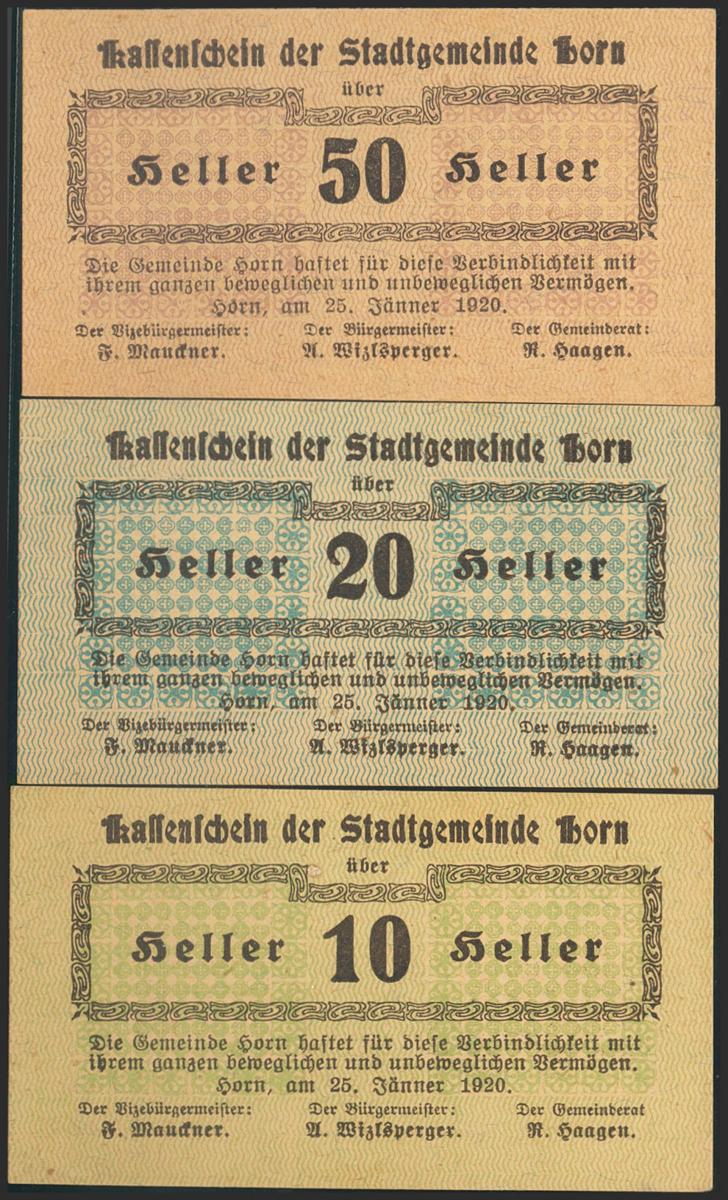 AUSTRIA. NOTGELD (HORN). Complete set of 3 banknotes: 10 Heller, 20 Heller, 50 Heller from 1920. About Uncirculated.