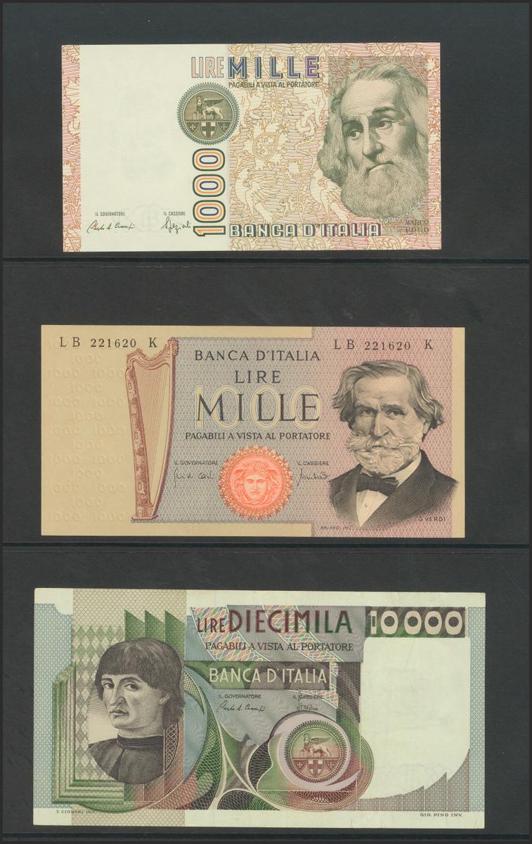 ITALY. Set of 3 banknotes: 1000 Lire (2), 10,000 Lire. (1971ca). (Pick: 101b, 106b, 109b). 106b has a small tear on left margin. About Uncirculated to Uncirculated.